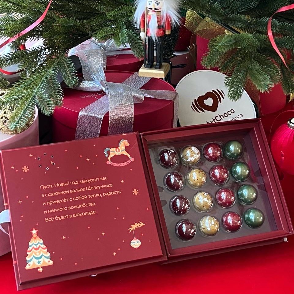 Внутри — авторская новогодняя коллекция конфет ArtChoco, созданная специально под эту концепцию. Мы делаем акцент не на избыточной сладости, а на балансе вкусов, текстур и натуральных ингредиентов.