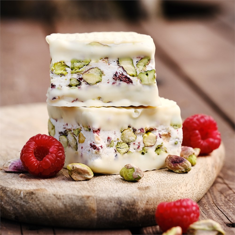Состав: фисташка, шоколад белый 31% (масло какао, сахар, сухое цельное молоко, эмульгатор соевый лецитин, натуральный экстракт ванили), мед, сахар, сироп глюкозы, яичный белок, малина сушенная.
