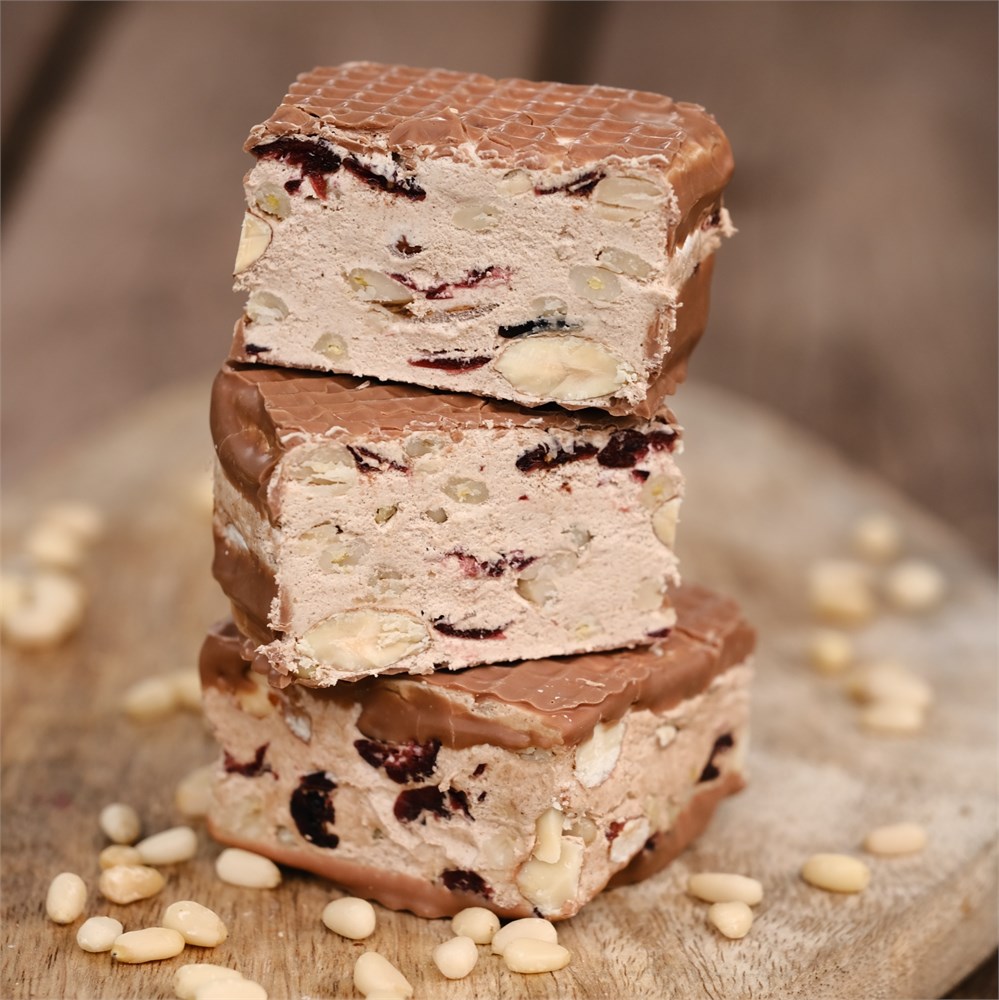Наша нуга разработана по авторскому рецепту, в ней содержится высокий процент орехов и цукатов (до 50%), так же для придания вкуса и нужной текстуры к базовым ингредиентам мы добавляем шоколад и какао-маcло. Мы используем премиальный швейцарский шоколад Felchlin - лучший профессиональный шоколад на российском рынке. Каждый батончик имеет шоколадное покрытие.