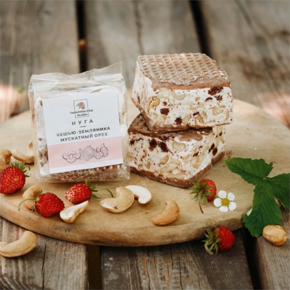 Состав: кешью, шоколад белый 31% (масло какао, сахар, сухое цельное молоко, эмульгатор соевый лецитин, натуральный экстракт ванили), шоколад молочный 35% (какао-бобы, сахар, масло какао, сухое цельное молоко, эмульгатор соевый лецитин, натуральный экстракт ванили), земляника вяленая, мед, сахар, сироп глюкозы, яичный белок, пудра йогурта, мускатный орех.
