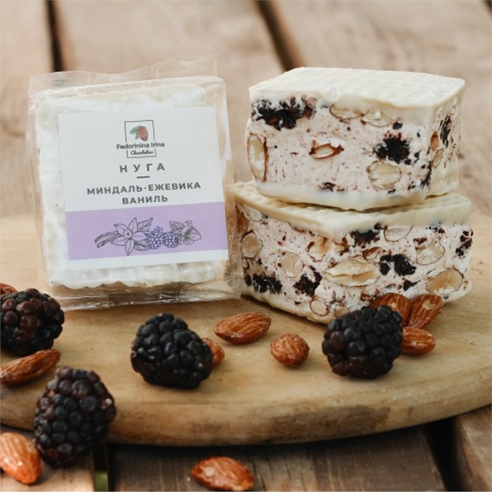 Состав: миндаль, шоколад белый 31% (масло какао, сахар, сухое цельное молоко, эмульгатор соевый лецитин, натуральный экстракт ванили), мед, сахар, сироп глюкозы, яичный белок, ежевика вяленая, пудра йогурта, семена ванили.