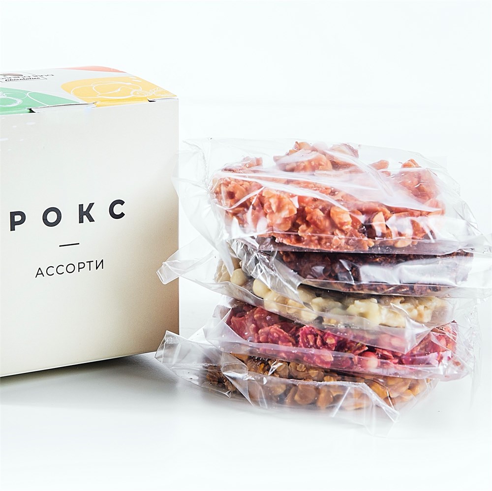 Cостав: миндальные лепестки, белый шоколад, темный шоколад, карамельный шоколад, молочный шоколад, клубничный шоколад Valrhona Inspiration, фисташки, арахис, фундук, цукаты имбиря, пудра йогурта, цукаты апельсина, манго сушенный, цукаты помидора черри, цедра апельсина, корица, соль