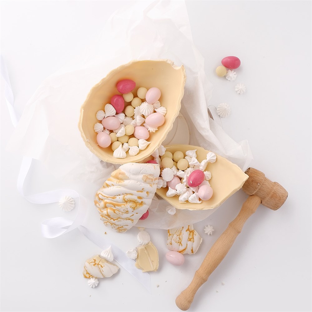 Наполнение яйца: шоколадки, драже фундук, меренга.В комплекте идет деревянный молоток.